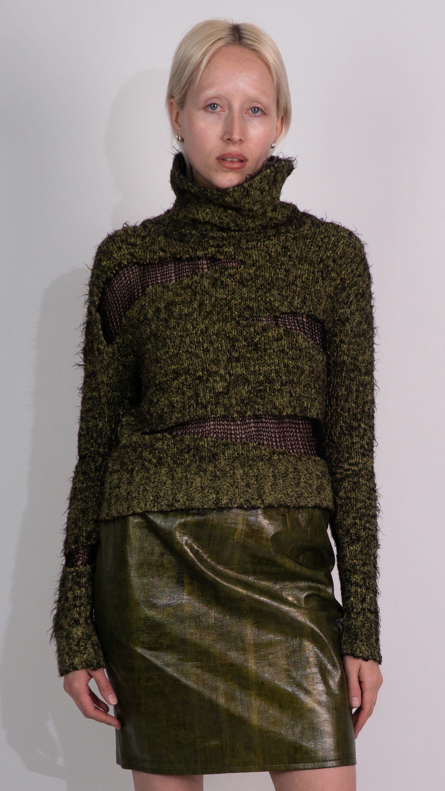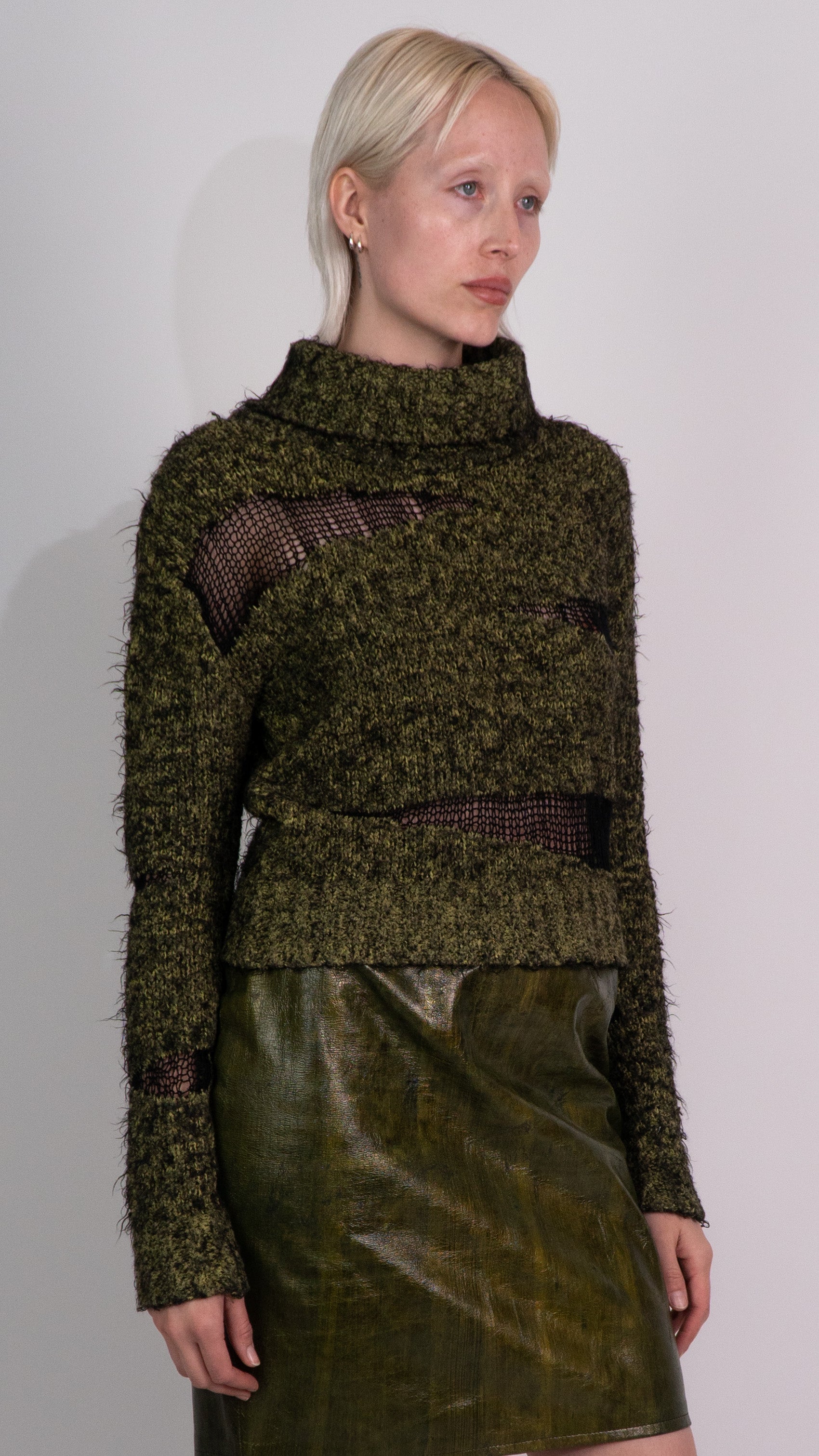 Cop Copine Green Turtle Neck Jumper with Mesh Cut Out Details
