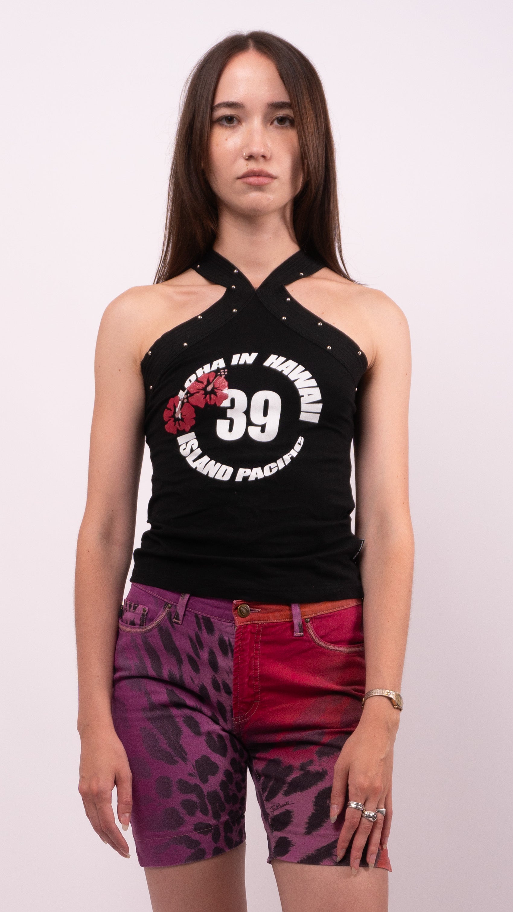 Denny Rose Twisted Studded Halter Neck Graphic Top